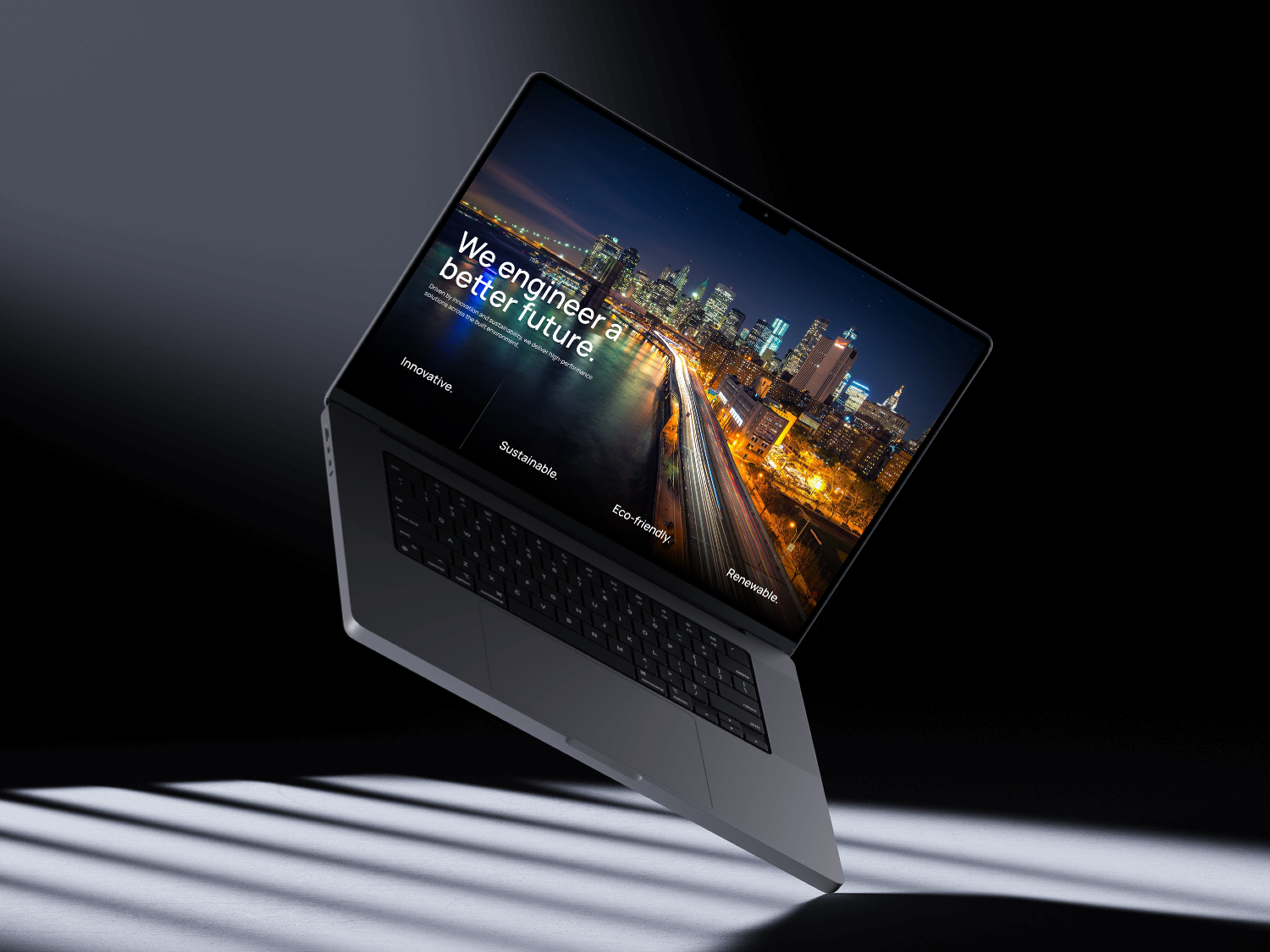 First, it lets the photography lead. Engineering project images are colorful and detailed — steel structures against blue skies, city skylines at dusk, concrete textures in daylight. A dark UI makes those images pop without needing borders or containers.
